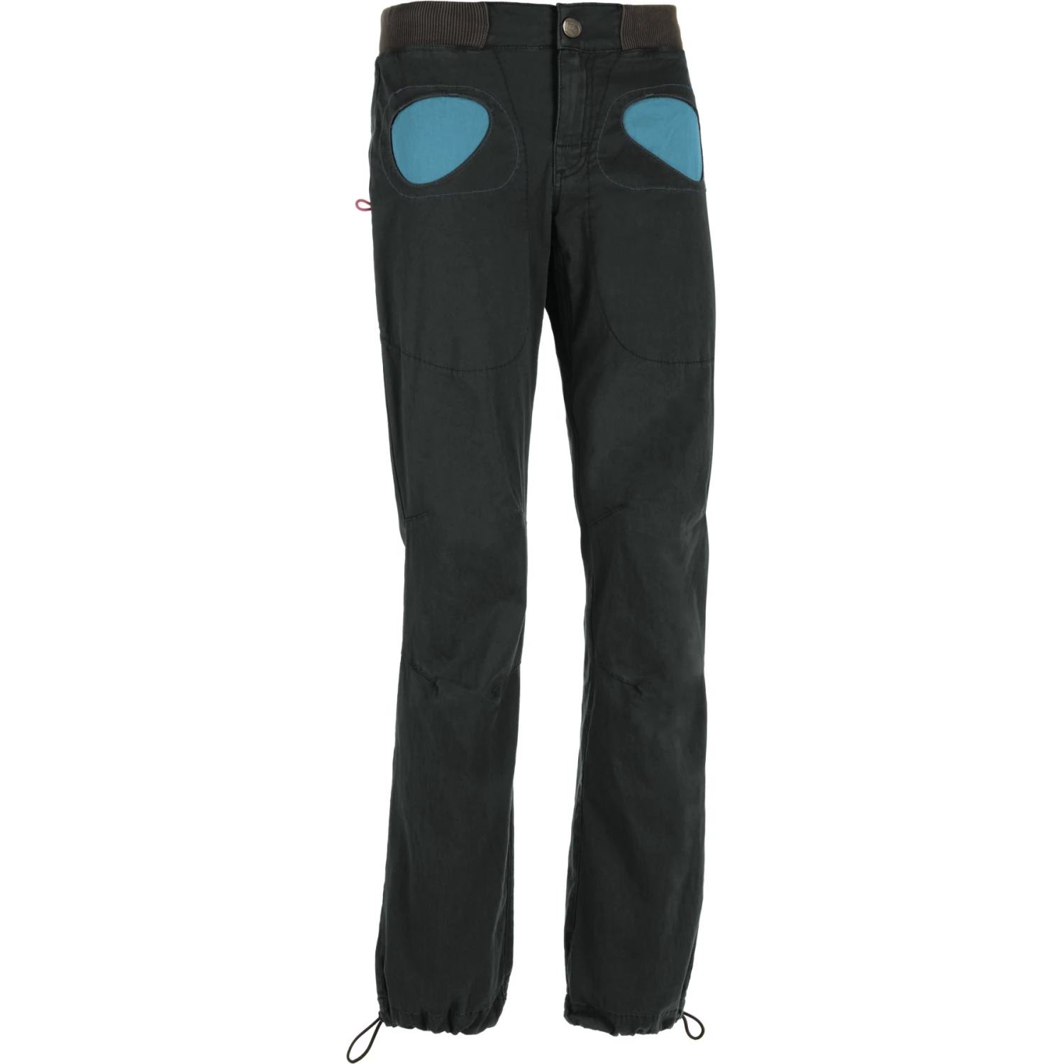 Een klimbroek van duurzame katoenstof met een supercomfortabele, ca. 5 cm brede, elastische geribde tailleband die met een band in de breedte kan worden versteld en sluit met een drukknoop en een rits. Aan de broekspijpen zijn ook elastische koorden bevestigd om de wijdte te regelen, zodat de broek het zicht op de voeten bij het klimmen niet belemmert. Kleurcontrasterende ronde zakken aan de voorzijde en een ronde onderzak, alsmede voorgevormde knieën en lussen voor de boulderborstel ronden de algemene indruk van deze klassieke klimbroek af.