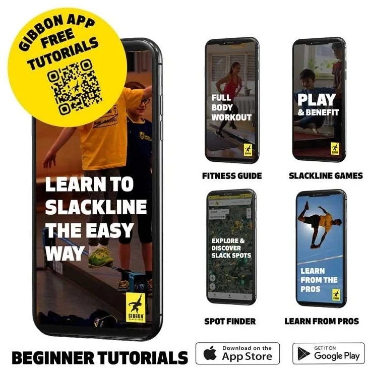 - Gibbon Slacklines BananaLama Treewear Set, blauw-geel, 25 meter (22,5m Slackline + 2 x 2m ratelband), beginner en gevorderde, longline, breedte webbing 1,5″/3,5cm + 2 x 2m ronde slings, 2 shackles en power ratel.