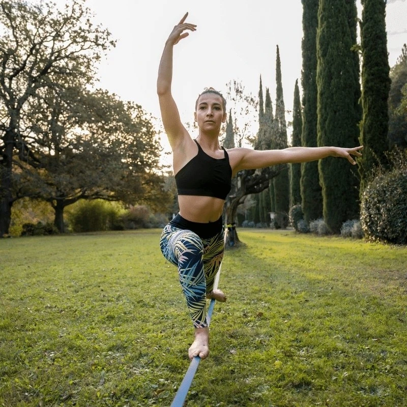 - Platte band, speciaal ontworpen voor slackline (trampoline-effect). Doorlopende opdruk voor betere grip en oriëntatie op de slackline. De ergonomisch geoptimaliseerde kunststof handgreep van de ratel zorgt voor comfortabel en efficiënt spannen.