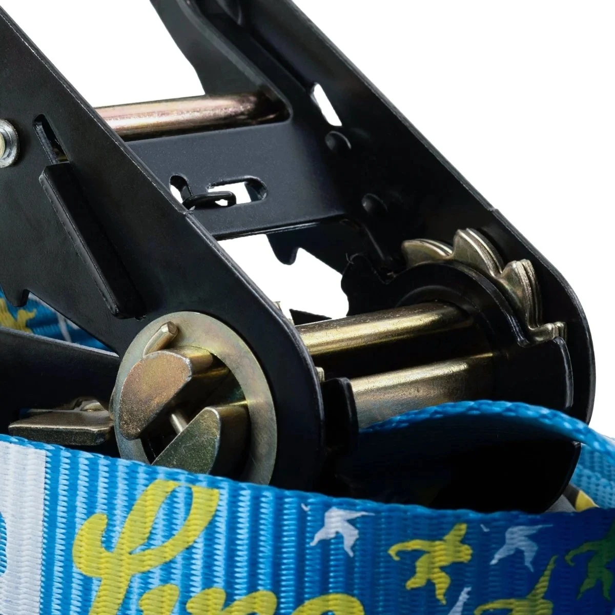 - Platte tape, speciaal ontworpen voor slackline (trampoline-effect). Doorlopende opdruk voor betere grip en oriëntatie op de slackline. De ergonomisch geoptimaliseerde kunststof handgreep van de ratel zorgt voor comfortabel en efficiënt spannen.