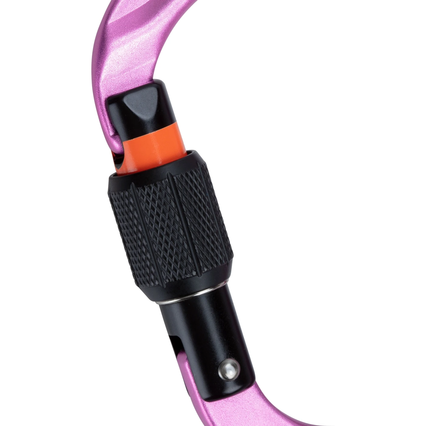 - Oranje markering waarschuwt wanneer de karabijnhaak niet is vastgeschroefd