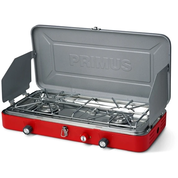 Dit robuuste, op de camping beproefde kooktoestel is geschikt voor zware potten stoofvlees voor de hele groep en heeft nog voldoende ruimte voor een pan om gebakken eieren in te bakken. Elke brander ontbrandt gemakkelijk met de ingebouwde piëzo-ontsteker. De vlam kan nauwkeurig worden ingesteld met de aparte regelaar. De brander biedt een vlam van 3360 W die een liter water in drie minuten aan de kook brengt. Bij veel wind kan het zijwindscherm worden uitgetrokken voor een stabiele vlam.