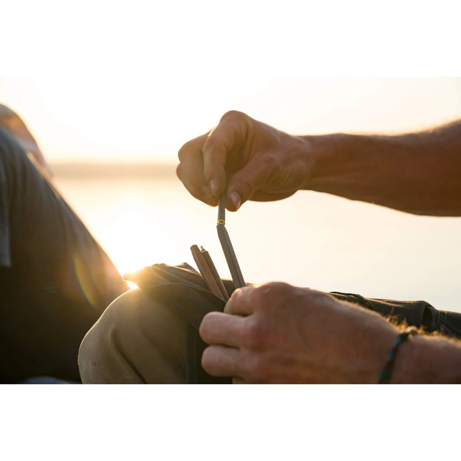 Sommige maaltijden kunnen alleen met stokjes worden gegeten. Punt. De CampFire eetstokjes zijn gemaakt van rozenhout en messing. Ze kunnen in tweeën worden gedeeld, zodat u ze snel en gemakkelijk kunt opbergen. Als het tijd is om te eten, schroef je ze gewoon weer in elkaar. Het messing verbindingsstuk zorgt voor stabiliteit tijdens het eten. Met stoffen bekleding.