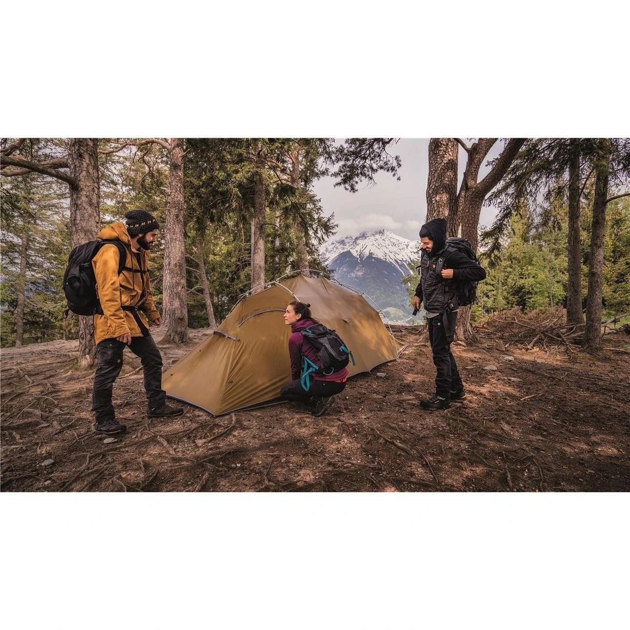 - Extra stabiliteit in extreme weersomstandigheden dankzij de eenvoudige maar slimme verbinding van buitentent, tentstokken en spantouwen door middel van een flexibele doeklus