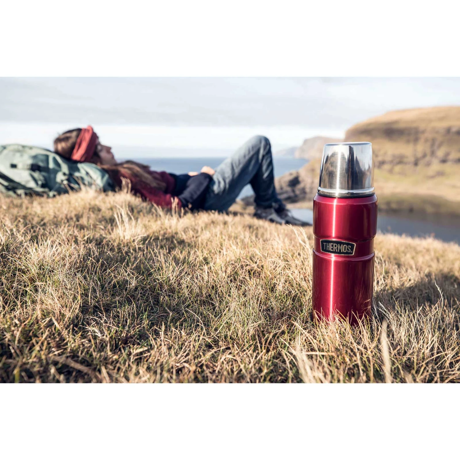 In de stadsjungle of in de vrije natuur – wie voortdurend onderweg is, heeft een sterke metgezel nodig waarop hij blindelings kan vertrouwen. Dat is THERMOS® Stainless King – de originele thermosfles van 470 ml zonder compromissen. Wat voor vrieskou geldt, geldt ook voor zinderende zomerhitte: het dubbelwandige roestvrij staal met THERMOS® isolatietechnologie stopt de temperatuuruitwisseling met de buitenwereld. Dit houdt warme dingen 12 uur lang warm en koude dingen 24 uur lang koud.
