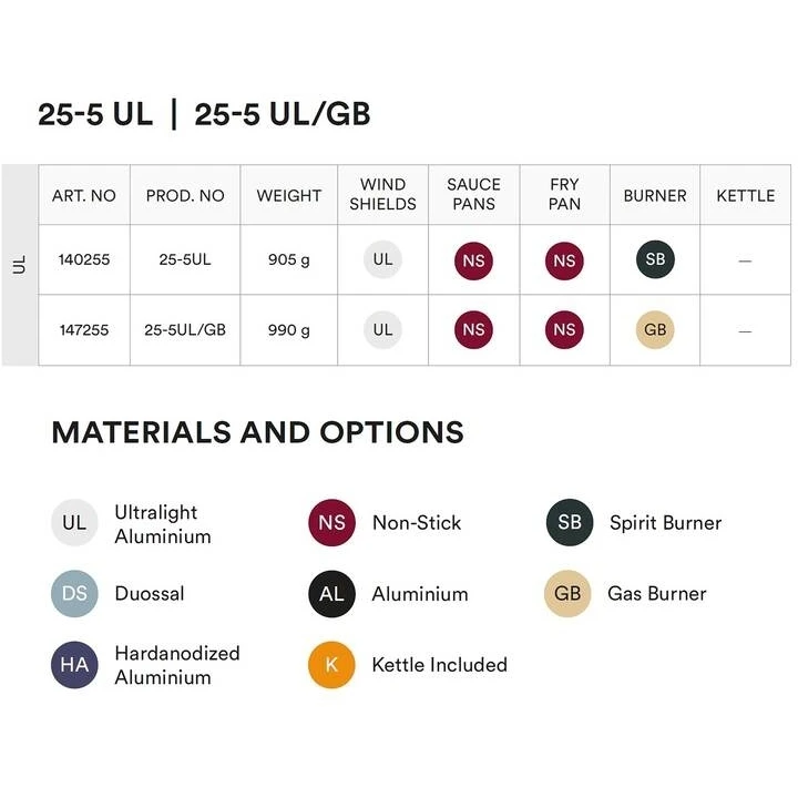 De 25-serie omvat iets grotere fornuizen die geschikt zijn voor groepen van ongeveer 3-4 personen. Het zijn uitstekende gezinsfornuizen met ruime pannen, een bredere koekenpan en een grotere ketel. Wanneer de steunen zijn opgeklapt, kan het fornuis worden gebruikt met grote billies uit de rest van het Trangia-assortiment.